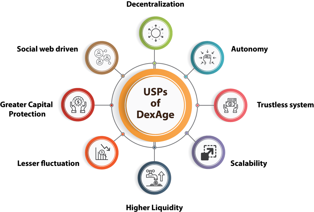 El intercambio descentralizado DexAge es un nuevo sistema autónomo y autosostenible, alimentado por la conexión social entre los comerciantes e inversores que utilizan la plataforma. El modelo de operaciones de DexAge capitaliza el poder de los usuarios y lo canaliza generando sinergias que se retroalimentan. La plataforma DXG junto con su dApp permite operar en un marco descentralizado; un enfoque que gana adeptos en la comunidad. Un entorno en línea ideado para permitir varias funciones que se describren a continuación. Los operadores, usuarios e inversores encuentran un nuevo competidor en el que intercambiar y prestar activos criptográficos.